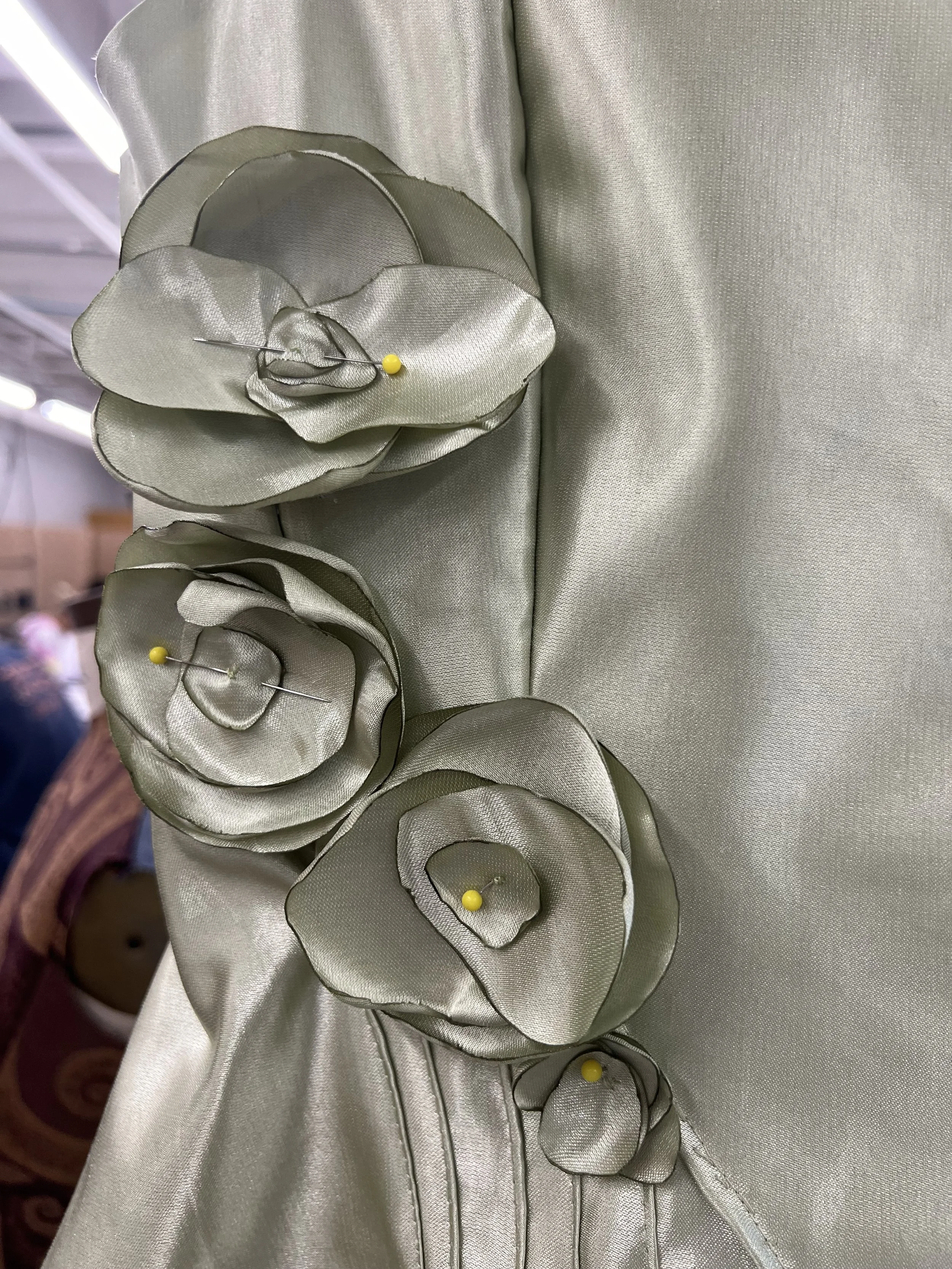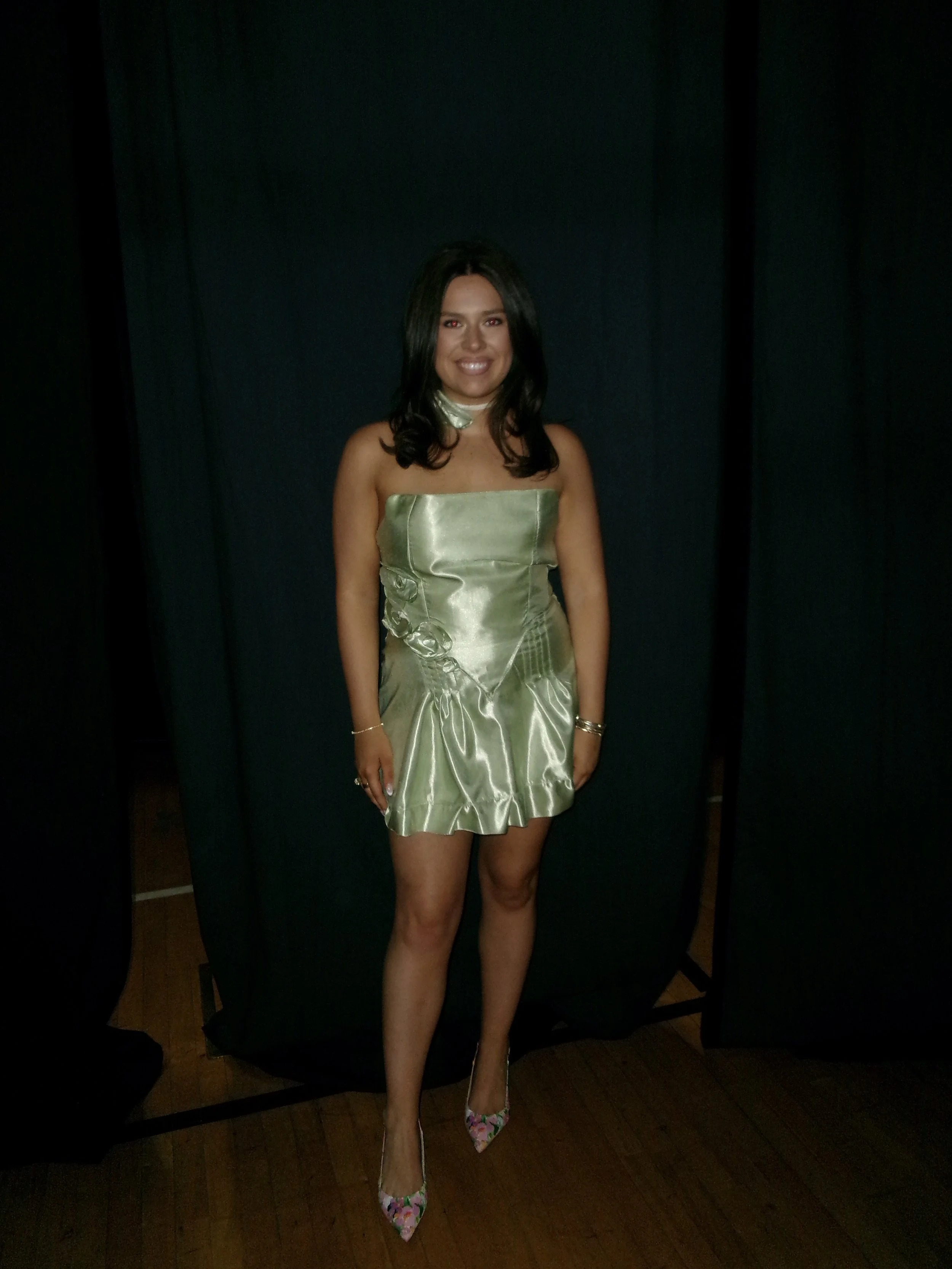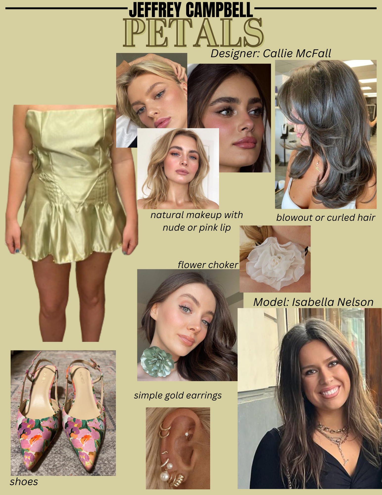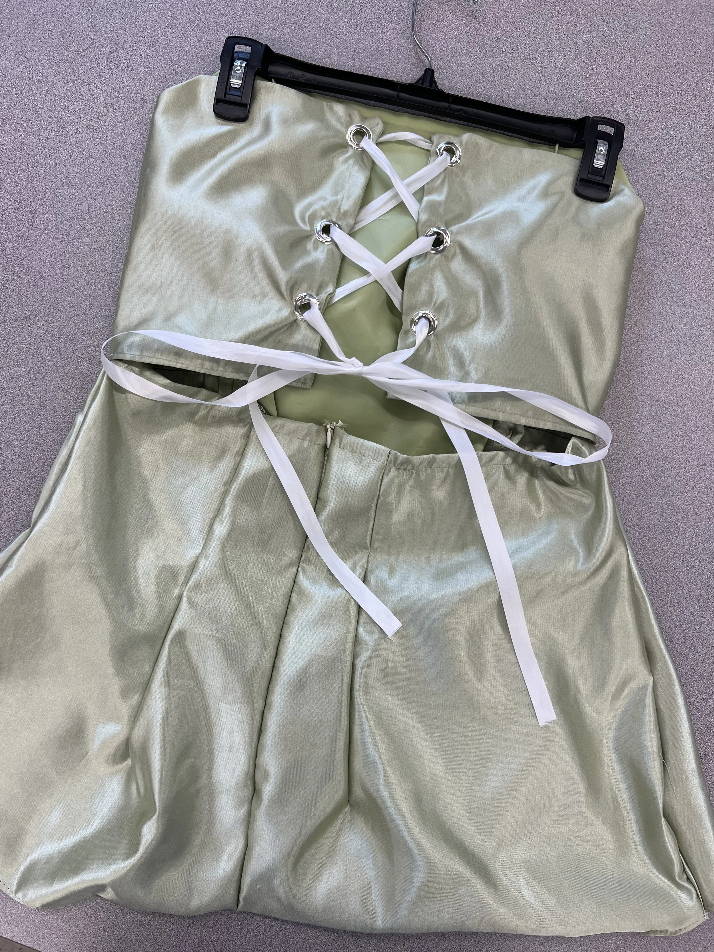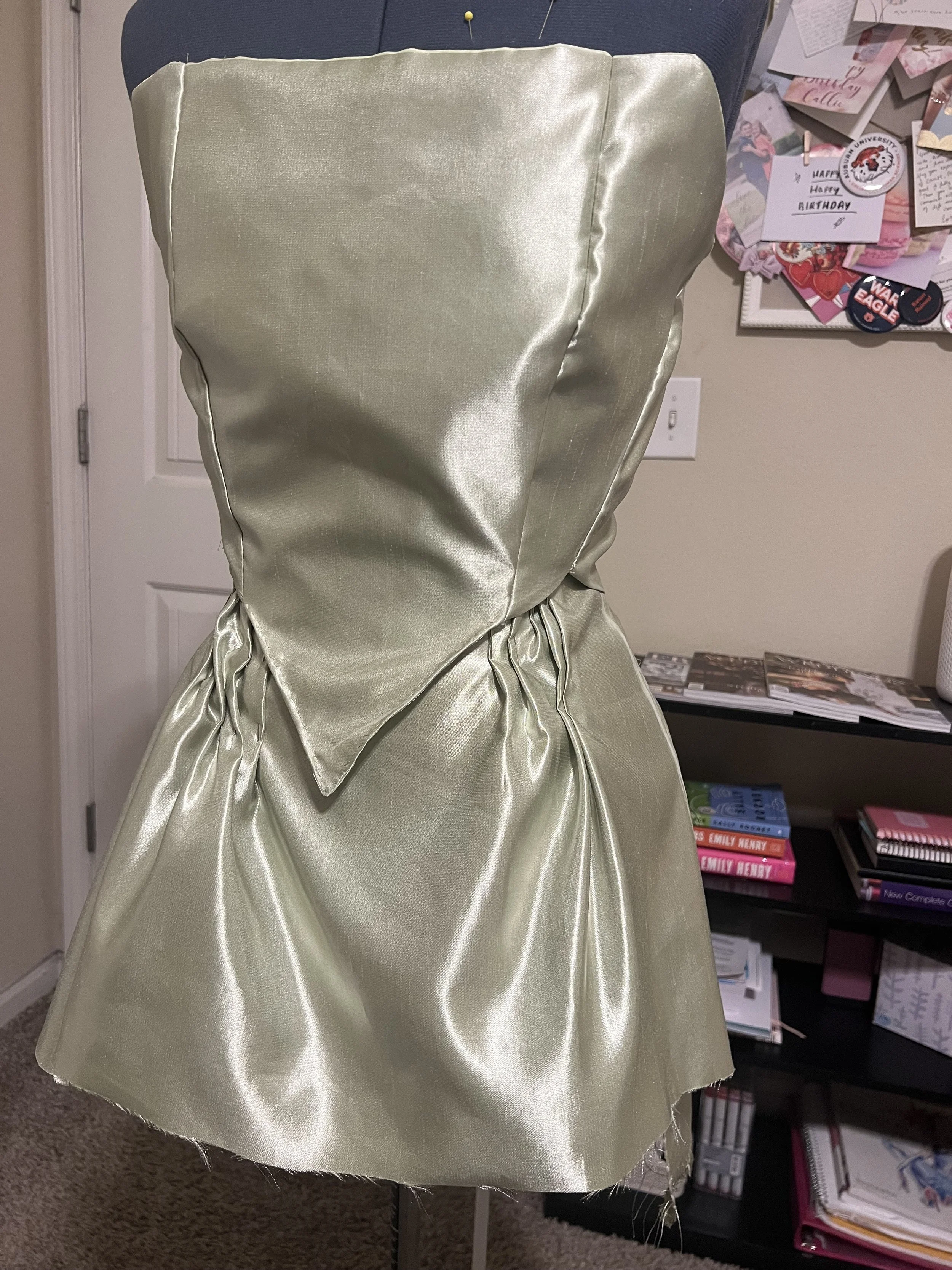 Petals is a green strapless mini dress with a square neckline, pleating details on the front and flowers placed on the side. When designing this dress, I wanted it to be fun and have touches of nature inspired elegance. The green color of Petals imitates the lushness of a garden, while the strapless design and square neckline give it a modern and chic feel. The pleating details add texture and dimension to the front of the dress, reminiscent of the delicate folds of flower petals. The placement of the flowers cascading down the side creates a whimsical and romantic touch. Petals is a celebration of beauty and femininity, designed for those who want to feel effortlessly glamorous and in tune with their inner beauty.