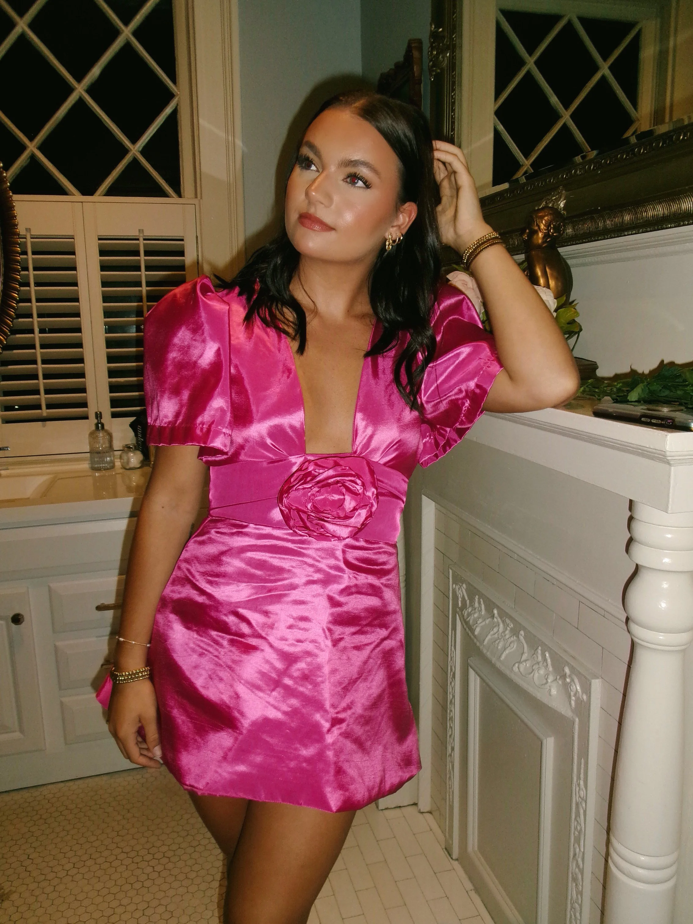 Sweet-on-You is a fuchsia mini dress with a plunging neckline, puff sleeves, and a rosette on the front. The plunging neckline and rosette detailing evoke a sense of femininity and romance, while the puff sleeves add a touch of drama and boldness. When creating this dress I was inspired by my love for weddings and all the fun outfits worn leading up to the big day. Sweet-on-You captures the essence of fun and flirtation; perfect for dancing the night away.