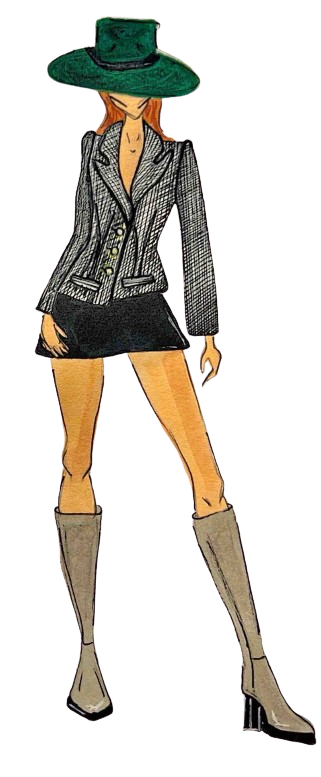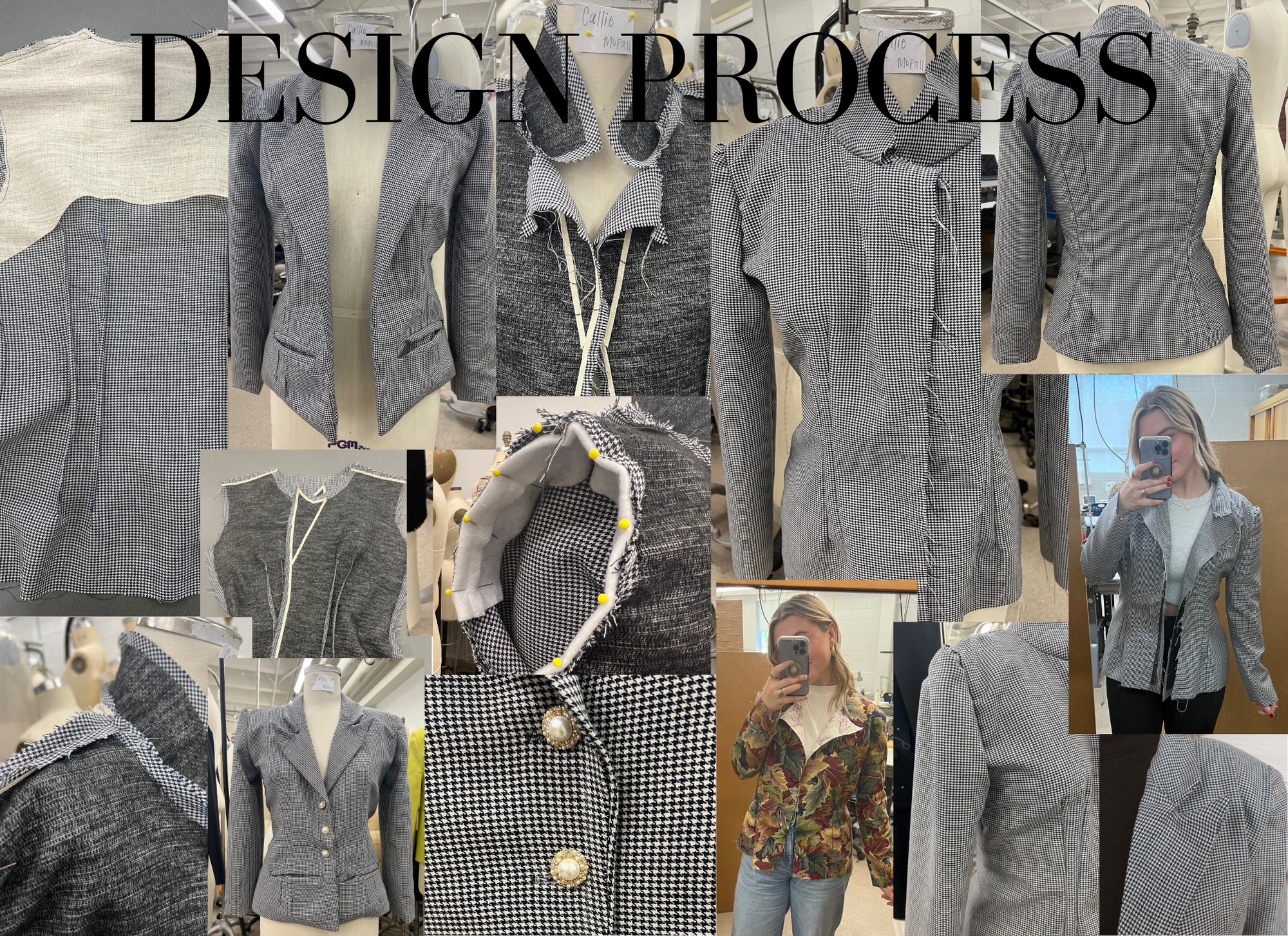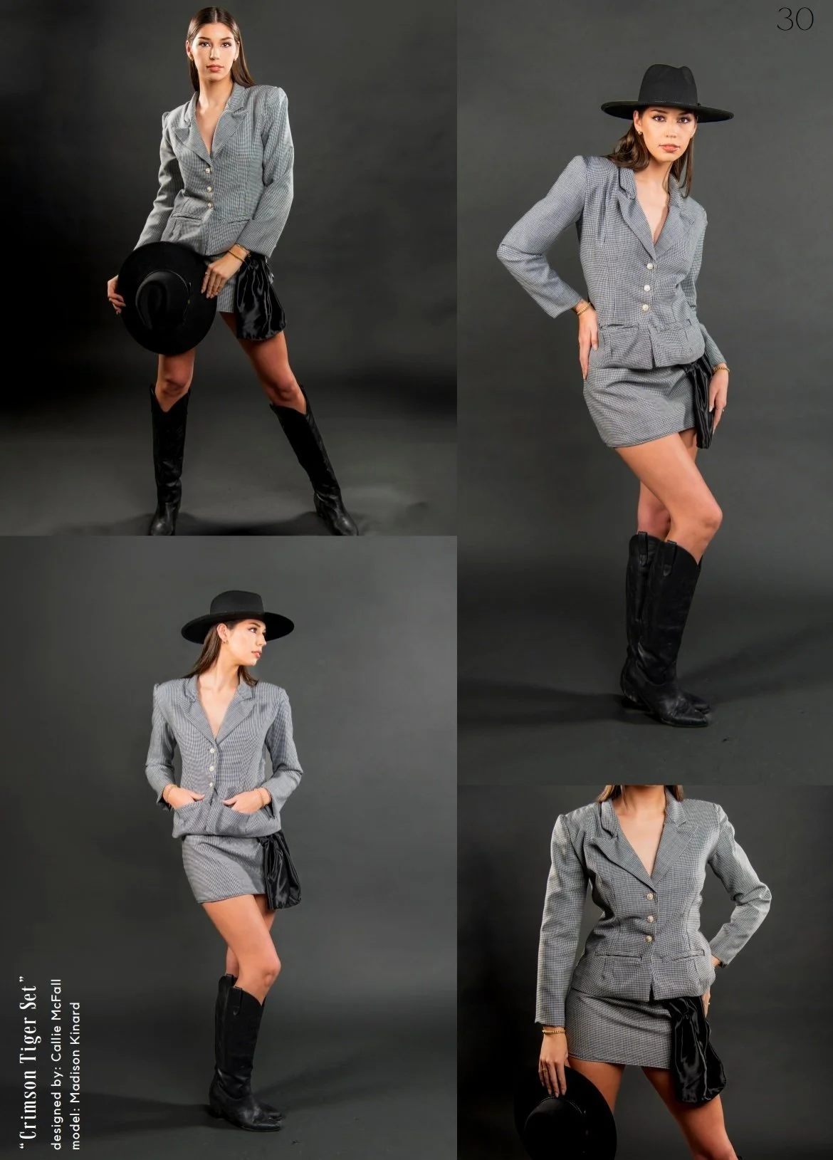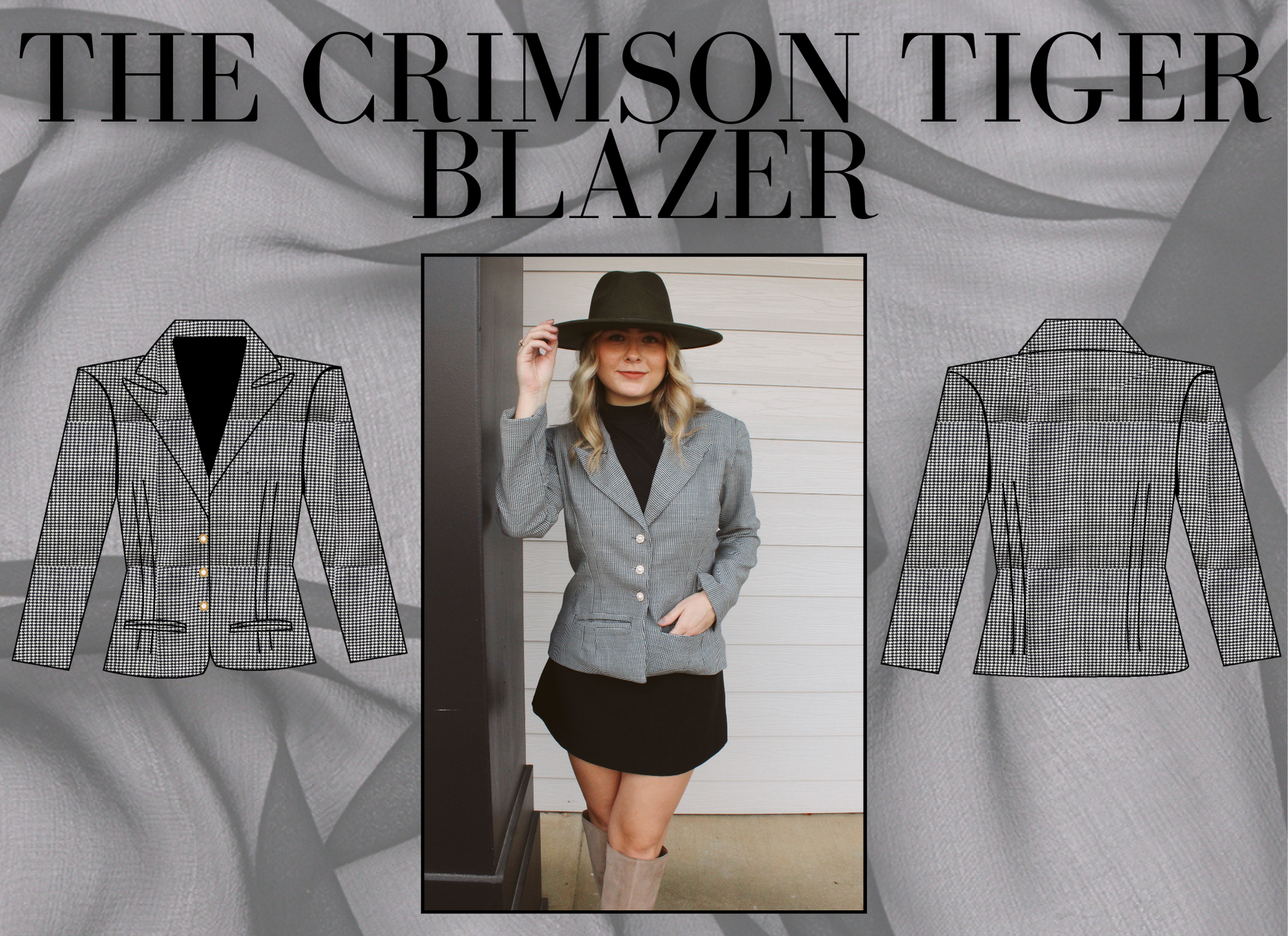The Crimson Tiger Blazer is crafted from a classic houndstooth wool and finished with gold and silver pearl buttons for a refined, timeless touch. Two welt pockets sit at the lower front, adding structure and functionality to the design. This piece was inspired by my lifelong connection to Alabama football and the rivalry between Auburn and Alabama. The blazer represents the blend of my past love for Alabama and my new pride in Auburn. The elegant pearl buttons bring sophistication to the design, while the styling possibilities make it versatile for any look. Paired with my felt hat and cowboy boots, the blazer takes on a Western-chic edge, showing how classic tailoring can meet personal style.